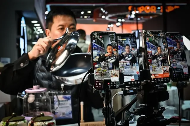 2026年3月12日,在中国上海新国际博览中心(SNIEC)举办的2026年中国家电及消费电子博览会(AWE2026)期间,一名男子在多支正进行直播录制的手机前进行直播带货。