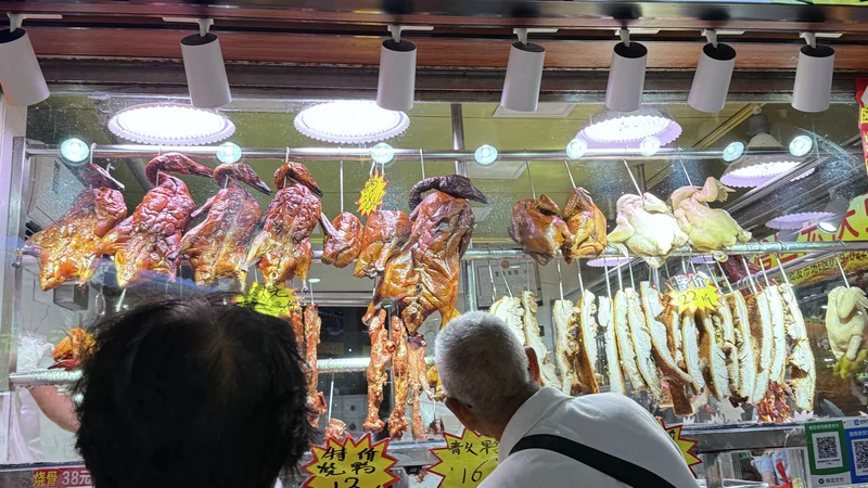 有间烧腊店,挂烧鹅卖烧肉,还有鸡。