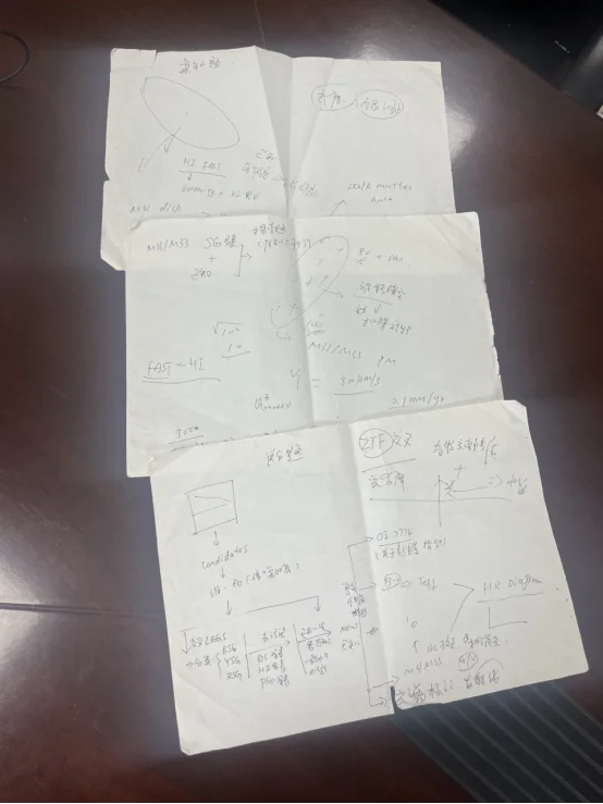 2023年国庆节期间,刚刚博士生一年级的吴昊去国家天文台找黄样,想聊聊读博期间的研究规划。黄样就用这三张草稿纸,给他梳理了一个“三步走”计划。吴昊其后完成的两个题目便是按照这个规划来做的。