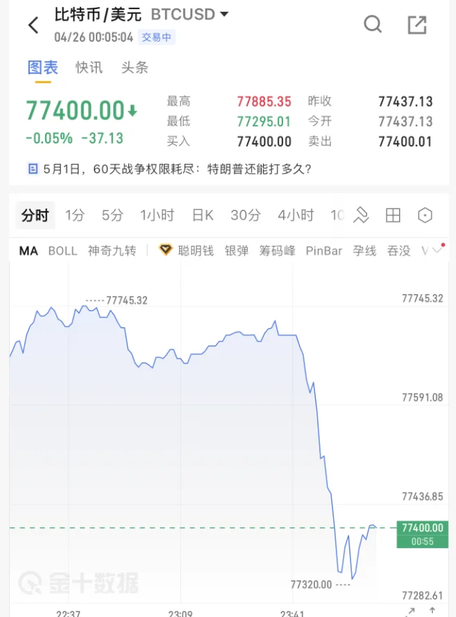受特朗普宣布取消美方代表赴巴基斯坦消息影响,原油暗盘突然拉升,比特币则直线跳水。