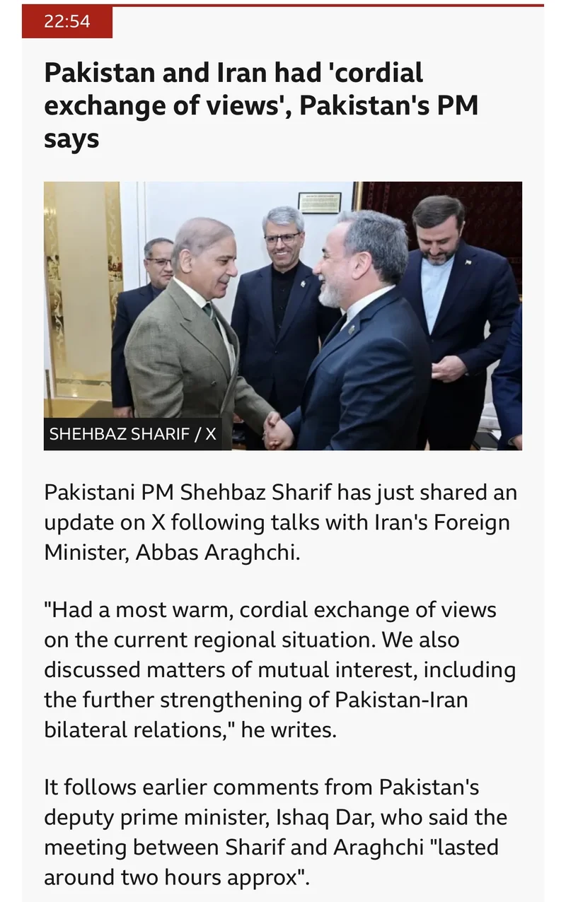 另据BBC报道:巴基斯坦总理谢赫巴兹·谢里夫在与伊朗外交部长阿巴斯·阿拉格希会谈后,刚刚在推特上分享了最新消息。他写道:“我们就当前地区局势进行了非常热烈友好的交流。我们还讨论了共同关心的问题,包括进一步加强巴基斯坦与伊朗的双边关系。”