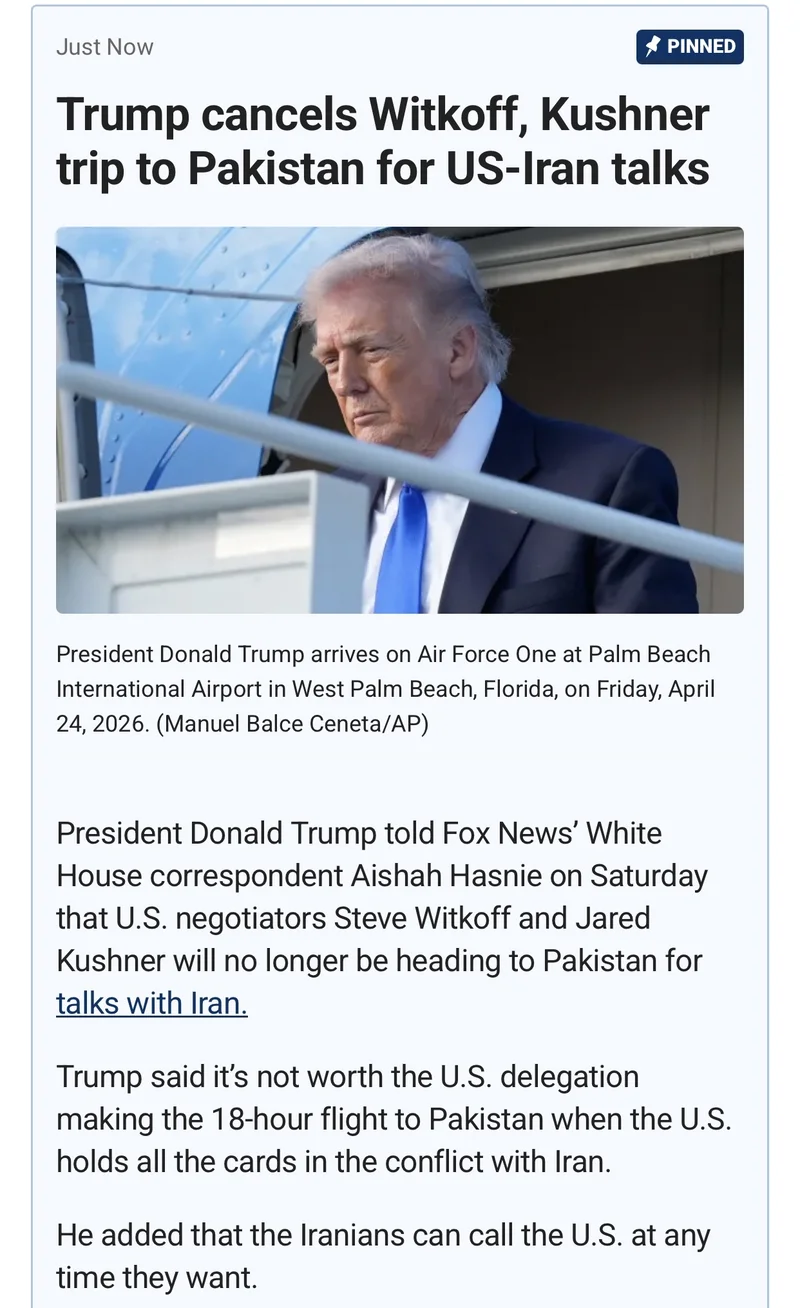 4月26日零点左右,特朗普对福克斯新闻白宫记者艾莎·哈斯尼表示,美国谈判代表史蒂夫·威特科夫和女婿贾里德·库什纳将不再前往巴基斯坦,与伊朗举行谈判。特朗普说,在美国掌握与伊朗冲突中所有筹码的情况下,让美国代表团飞行18个小时去巴基斯坦“不值得”。他补充说,伊朗人什么时候想谈,都可以随时给美国打电话。特朗普说:“我刚刚告诉我的人,他们本来都准备出发了。我说,不,你们不用飞18个小时去那里。我们手里握着所有牌。只要他们愿意,随时可以给我们打电话。但你们不会再为了坐在那里谈些毫无意义的东西,再飞18个小时了。”