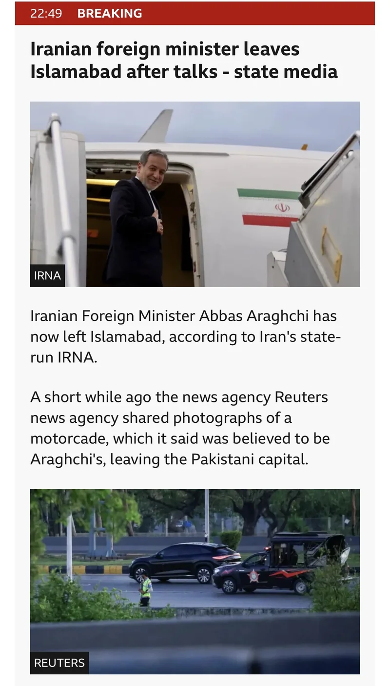 伊朗外交部长阿巴斯·阿拉格奇于当地时间周六晚间离开伊斯兰堡。此前,他曾在巴基斯坦首都举行会晤,讨论与华盛顿停火事宜,并与该地区的主要盟友进行磋商。