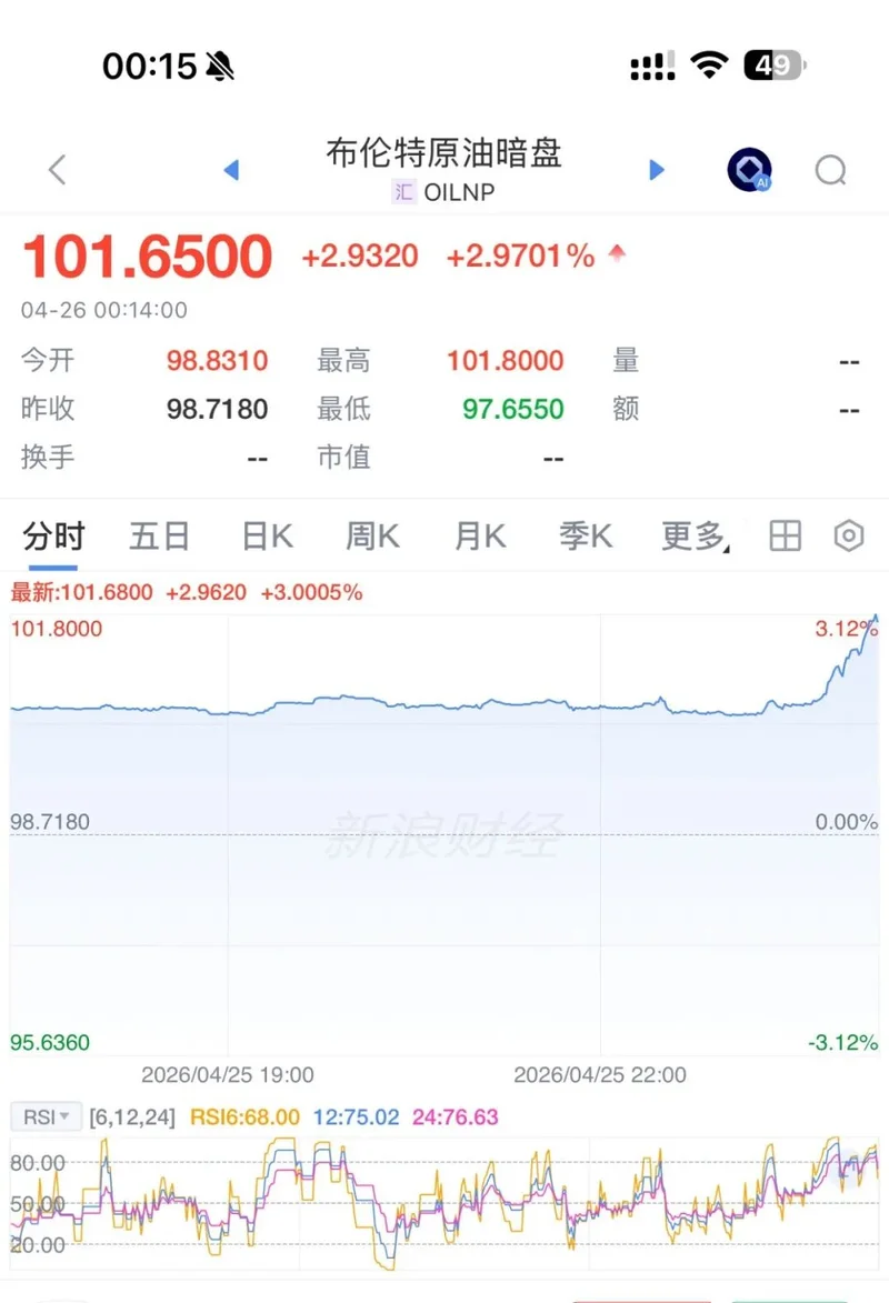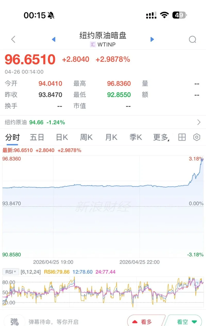 受特朗普宣布取消美方代表赴巴基斯坦消息影响,原油暗盘突然拉升。