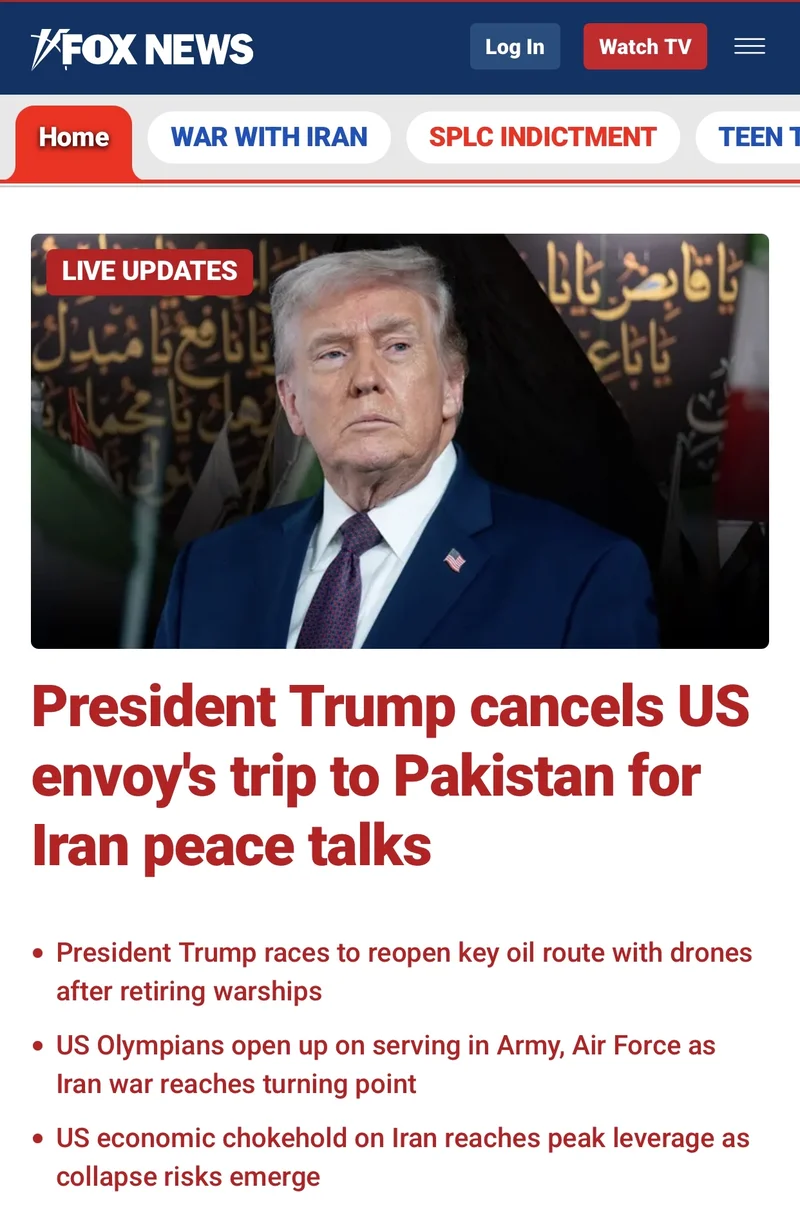 报道的原标题是《Trump cancels Witkoff, Kushner trip to Pakistan for US-Iran talks》(特朗普取消了威特科夫和库什纳前往巴基斯坦进行美伊会谈)。