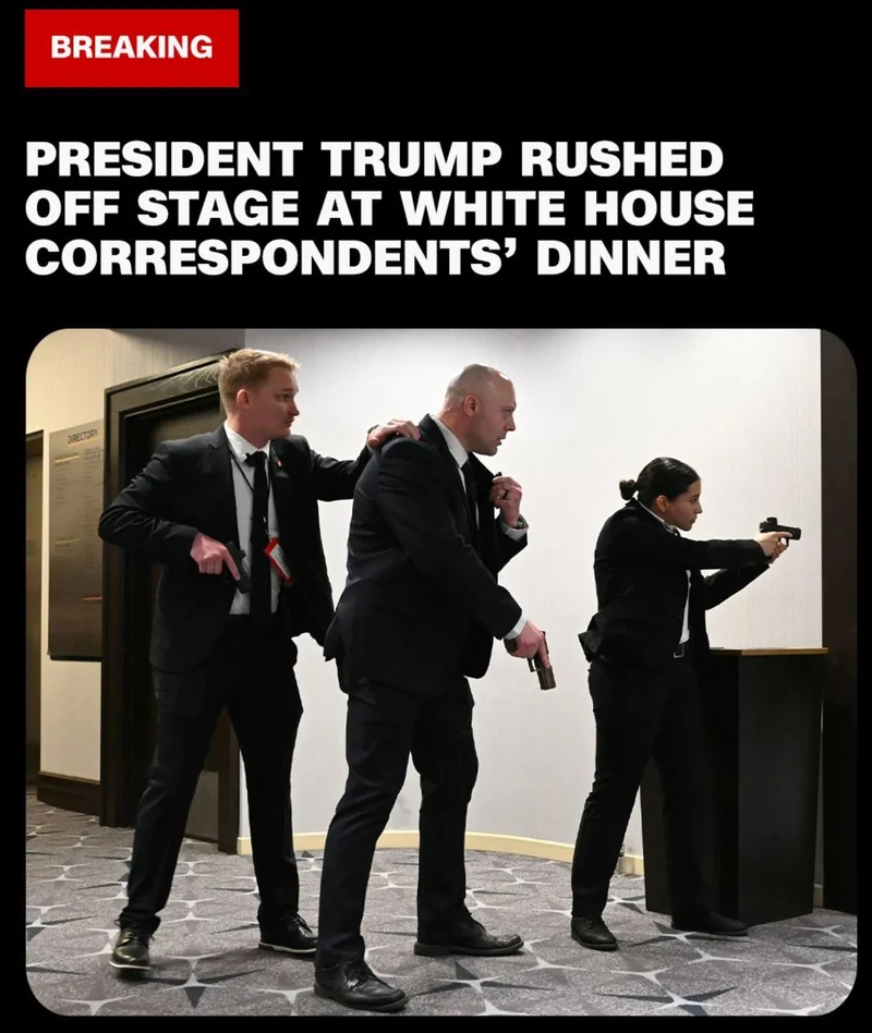 然后,几声巨响撕裂了大厅。特勤局特工拔枪戒备,护送特朗普和第一夫人紧急撤离。晚宴草草收场。