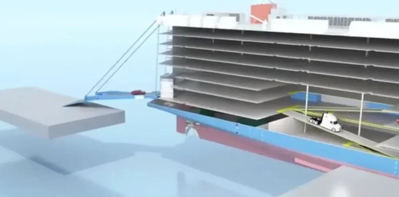 滚装设备是汽车上下船,在船上灵活调整位置的关键设备,包括用于上下船的艏门和艉门,以及船内车辆行走的可变斜坡通道、升降甲板等设备设施。