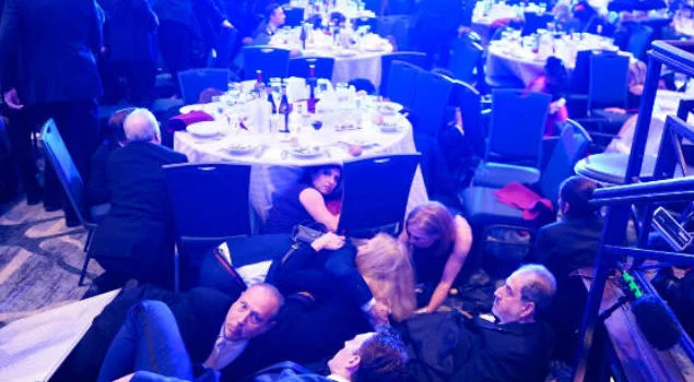25日晚枪击事件发生至今,各大媒体流传的照片,大多显示了总统、精英们仓皇逃命的混乱场面。枪声响起后,特朗普被执法人员团团围住并带下台,期间似乎踉跄了一下。
