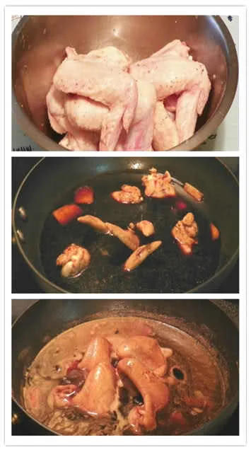 二、锅放入调料,放约大半锅水,大火烧开,收成慢火,熬至半锅水左右,主要是汤汁基本能没过鸡翅表面,等到虾眼水时(水稍滚,但不大滚,冒小汽泡),放入鸡翅,不断用勺把汤汁浇在鸡翅上;