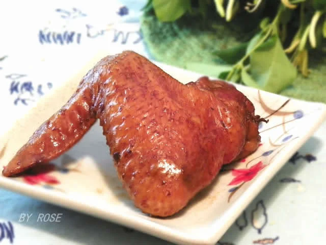 三、时不时要翻翻鸡翅,继续用勺把汤汁浇在鸡翅上,直至鸡翅熟和入色,用筷子在肉厚的地方扎一扎,看有无血水流,如无血水,表明熟了,共30分钟左右,但时间也要看鸡翅的大小而定。
