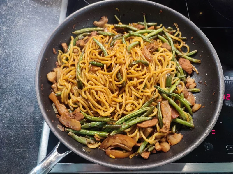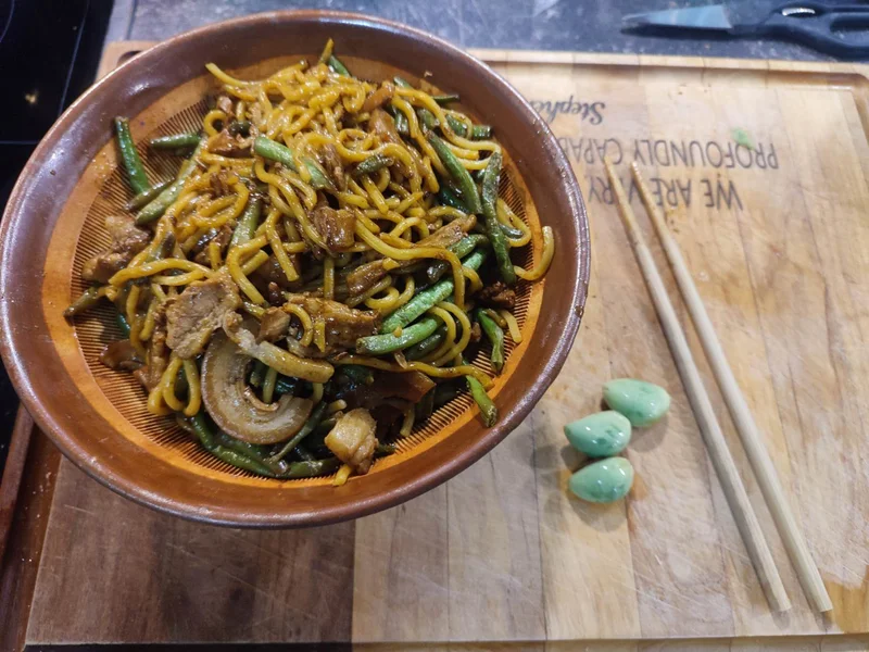 这不周末了吗,于是老老实实去超市,买了五花肉、豆角、面条。回来切肉、择豆角、拍蒜、切姜,一通忙活。锅里油热了,把肉片煸得滋滋响,边缘微微卷起,焦黄焦黄的。下葱姜蒜爆锅,香味“唰”地一下炸开。再下豆角,翻炒到翠绿。加水,酱油,盐,大火烧开,先焖个二十分钟。然后舀出一小碗汤汁,把提前蒸好的面条铺上去。盖上盖子,小火再焖。