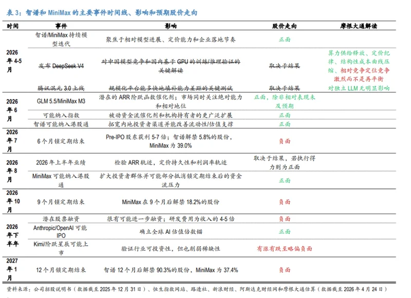 需要注意的风险节点:7月,智谱6个月锁定期届满,解禁5.8%股份;MiniMax解禁比例更高,达39.0%。2027年1月,智谱12个月锁定期届满,届时将解禁90.3%股份。