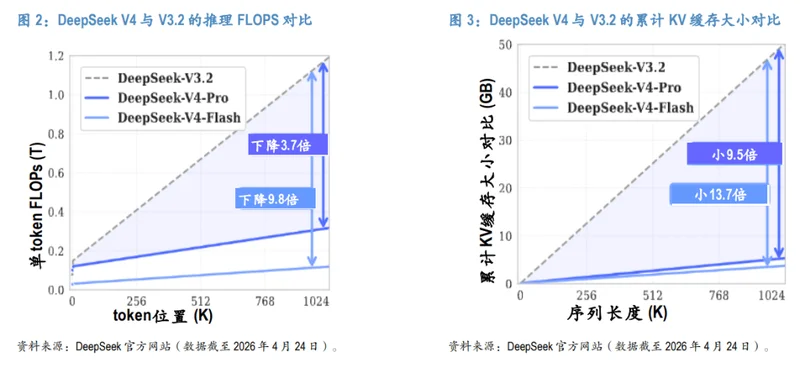 V4在技术层面确有进步。报告引用DeepSeek官方数据显示,与V3.2相比,V4在推理FLOPS上下降了3.7至9.8倍,KV缓存大小缩小了9.5至13.7倍,长上下文处理效率大幅提升。