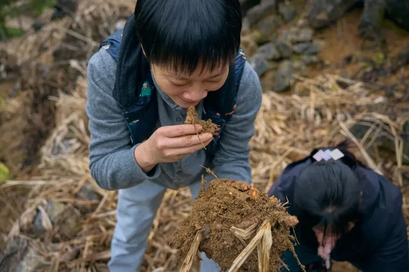 车子再往里开,她时不时停下来采一些粗壮的松针,又掰了一大段山黄皮树的树枝和树叶,还在山坡上挖了一些姜黄,在小梅家地里采了不少蔬菜,通通放在赖赖车上,说要拿回去做菜吃,“我就是看到什么,想到什么,就拿起来做菜,很随性”。我跟丹萍说,你可真时髦,这不就相当于国外厨师流行的“野外觅食”(foraging),在野外看到什么就摘回到餐厅,自由发挥出给顾客的菜式。