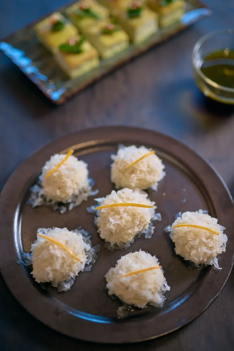 球状的豆腐块外面裹着切碎的银耳,像毛茸茸的小球
