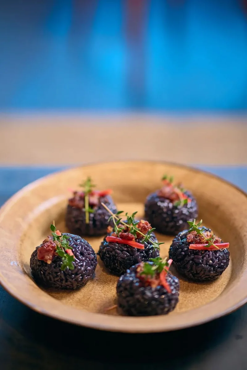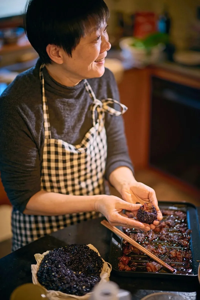 没想到的是,赖赖没把烤箱参数调整好,酸肉烤煳了。周围一圈的米粒变得焦香,酸肉的颜色也变黑了。一向要求完美的丹萍哭笑不得,准备将酸肉整盘扔掉。我看着舍不得,挑了一块火候不太重的,再挖了一团用枫叶染黑的熟糯米饭,直接塞进嘴里。哎呀,没想到这么香!肉的焦香和油脂跟糯米饭的嚼劲相得益彰,突然从咸味中间冲出来的酸味和枫叶的植物气息又一下子引领了整个味觉走向。人一个激灵,是从黏腻走向清爽的口感。于是我们享受了这个意外的安排,开开心心地把酸肉一块块扒下来,塞进糯米饭中,做成了饭团。