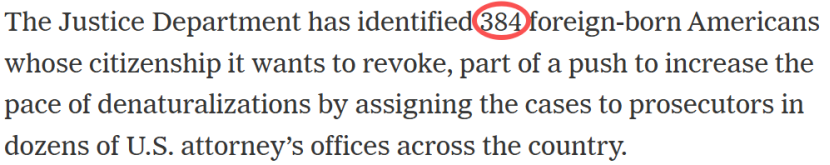 司法部高级官员在上周的一次会议中已下达通知,指派39个地区检察官办公室的检察官处理这些撤销国籍案件。但目前尚不清楚为何这384名特定个人被列为目标。