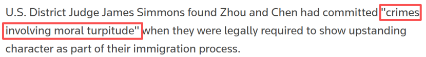 法官詹姆斯·西蒙斯(James Simmons)认为,周某和陈某的行为属于“道德败坏的犯罪”(crimes involving moral turpitude),违反了在移民过程中需要展示的良好品行。