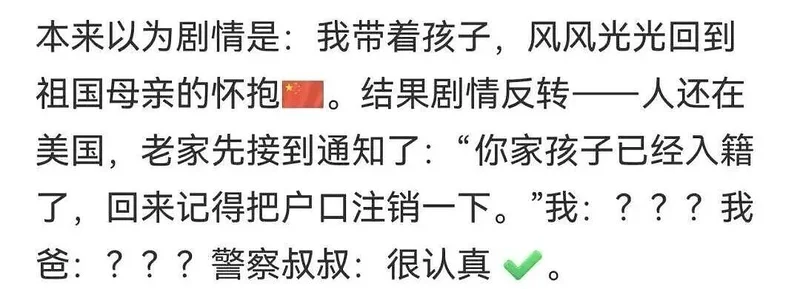 本来以为剧情是:我带着孩子,风风光光回到祖国母亲的怀抱。结果剧情反转——人还在美国,老家先接到通知了。