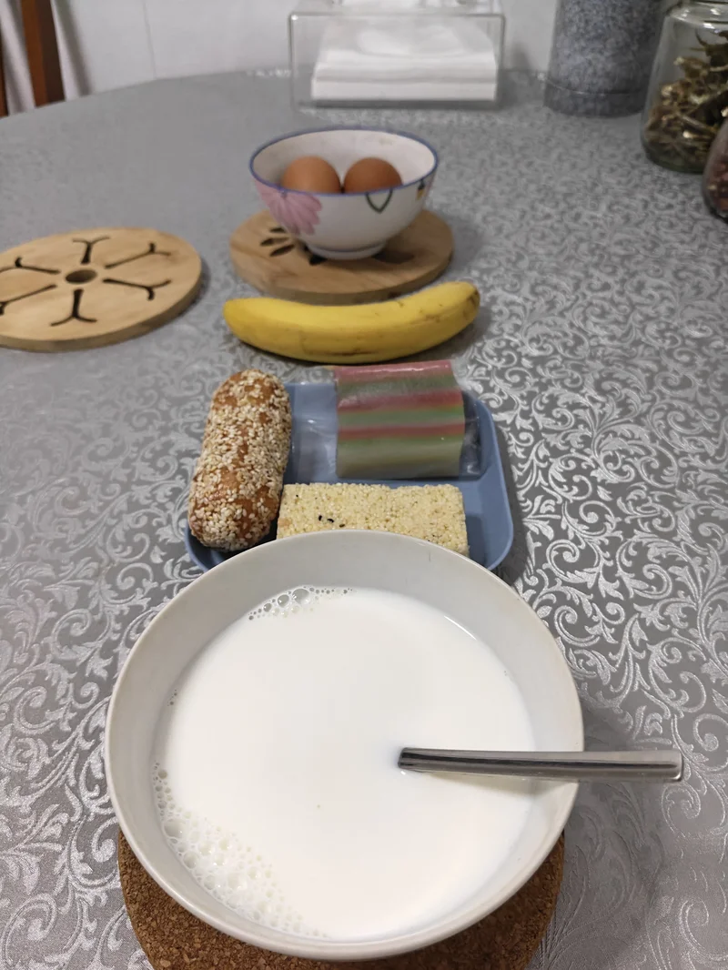 今日早点, 彩虹送的点心九层粿+一个麻枣+一块米酥+一杯牛奶+两个水煮蛋