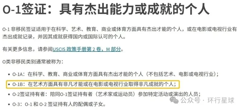 O-1B签证,按照美国移民局的定义,“适用于在艺术领域具有非凡才能或在电影和电视行业具有非凡成就的个人”。