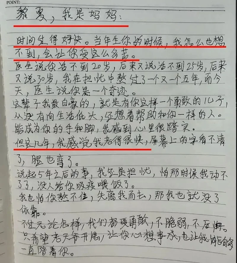 在信中她说,自己怎么也想不到生下黎夏会让他受这么多苦。医生一开始说他活不到20岁,后来又变成25岁,再后来变成了30岁。