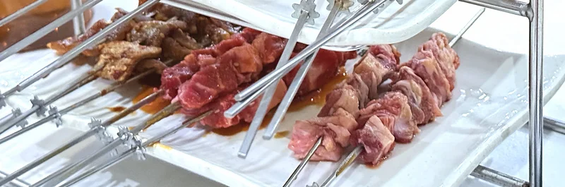 鲜羊肉串、蜜汁肉串和牛肉串。