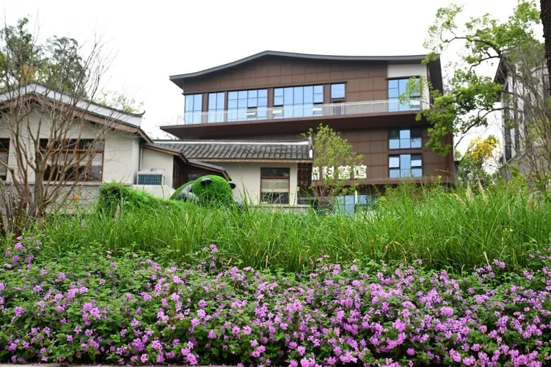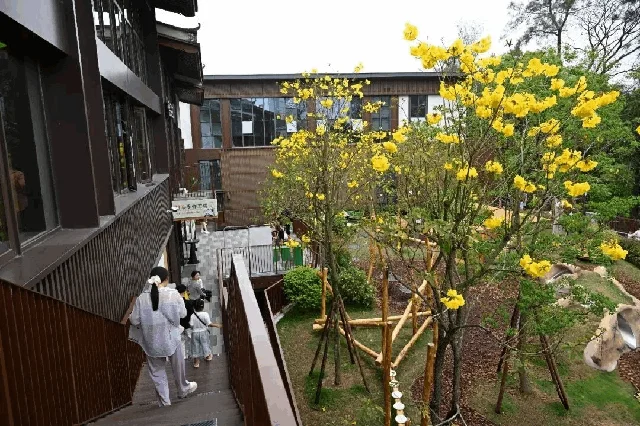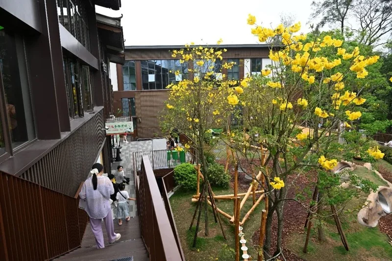金黄色『风铃』与古厝风格的大熊猫院子相映成趣
