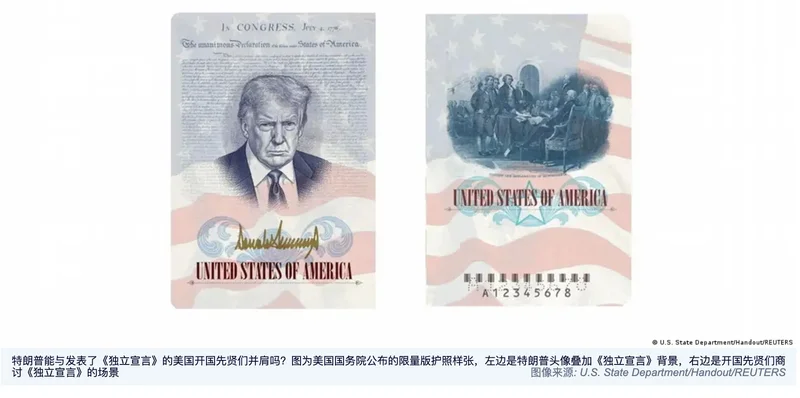 继特朗普纪念金币、特朗普签名纸钞、特朗普冠名艺术中心后,美国国务院宣布,纪念美国独立250周年的限量版新护照上将印有特朗普总统的大头像。目前,暂不清楚民众在申领护照时能否拒绝这一版本。