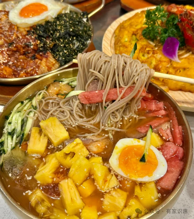 荞麦面劲道爽滑,冰镇牛肉汤酸甜开胃,配上牛肉片、辣白菜、苹果片。这碗面冰凉清爽,越吃越上瘾,东北夏天没有冷面,那还过个啥劲儿?