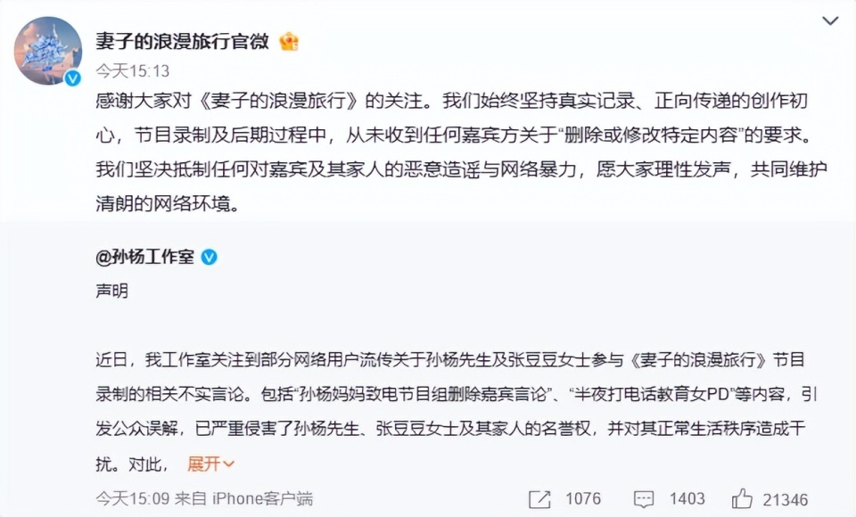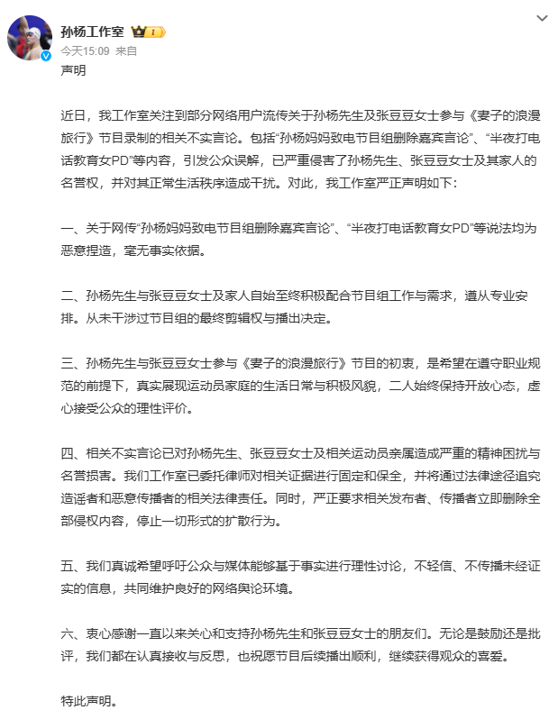 不过孙杨工作室已经清清楚楚地辟谣,而《妻旅》节目组也下场澄清,表示没有收到过这样的要求。