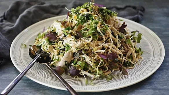 将丰盛的晚餐换成充实的午餐,例如这种配有大颗粒坚果是拉差酱的水煮鸡肉荞麦面沙拉。