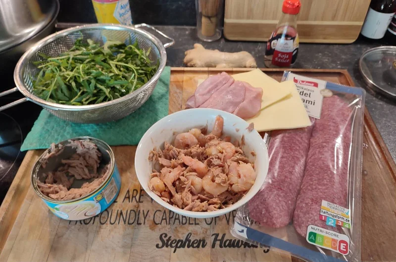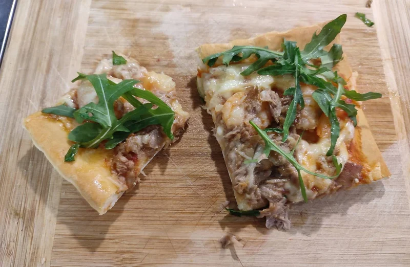 今儿只能偷懒,是下班买的半成品,罗马大方饼坯,萨拉米肠子得透亮,鸡脯火腿改成蝉翼片,让我想起前门大街“天福号”老师傅那手片酱肉的的刀工。罐头金枪鱼肉拌上虾仁,淋上橄榄油加蒜末,再偷偷来点中国生抽,咱玩儿的就是个六亲不认,不按套路;中西合璧,也别管它谁是谁了。