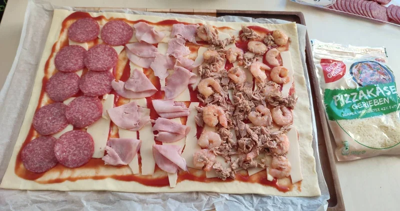 赶紧去采购,然后就在厨房里折腾。今儿个我要学那韩信,把萨拉米香肠子、鸡脯火腿子、金枪鱼肉裹大虾往面饼上一摆拼,倒像是调遣三军——天上飞的、地上跑的、海里游的,都叫咱点兵,美其名曰“海陆空罗马大将军”。