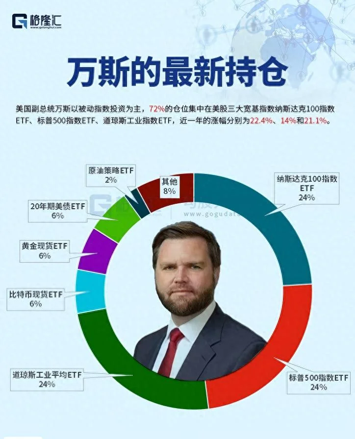 美国副总统万斯以被动指数投资为主,72%的仓位集中在美股三大宽基指数——纳斯达克100指数ETF、标普500指数ETF、道琼斯工业指数ETF,近一年的涨幅分别为22.4%、14%和21.1%。