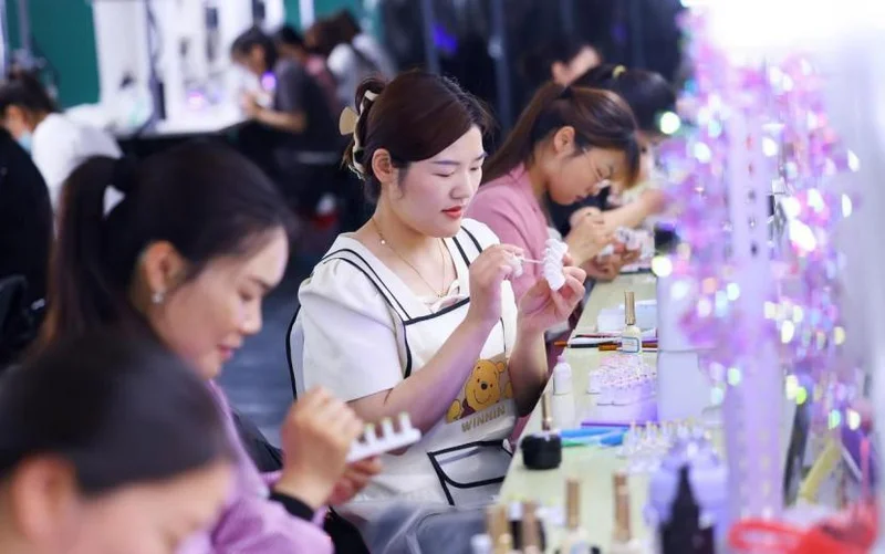 穿戴甲门店从最初的寥寥数家到现在三两步就有一家实体店。门店数量的增长拉动了全县5万名人员的就业,其中的九成都是宝妈。