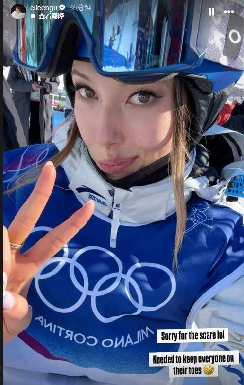 赛后,谷爱凌在社媒上发自拍并配文:抱歉吓到大家,就是想让大家都保持紧张感。