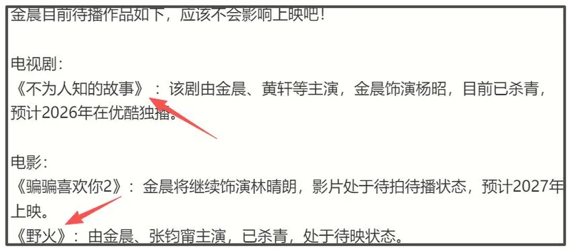 至于金晨的另外两部作品《野火》和《不为人知的故事》据传已经杀青了,自然更不成问题,播出只是时间问题。