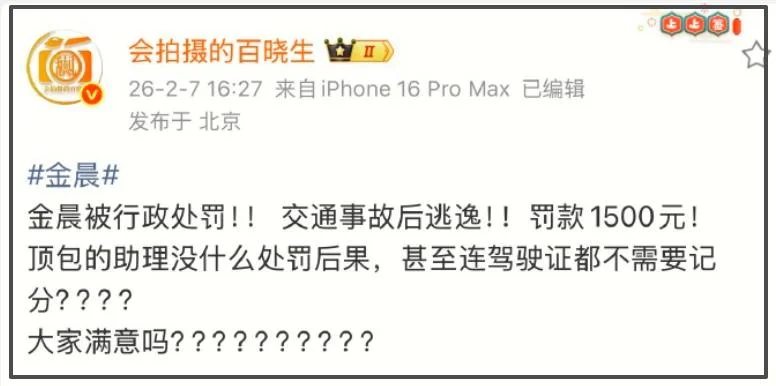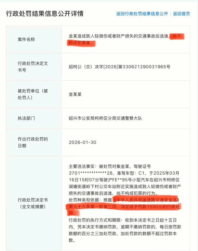 2月7日,网友查询到金晨肇事逃逸事件的处理结果是,金晨被罚款1500元。