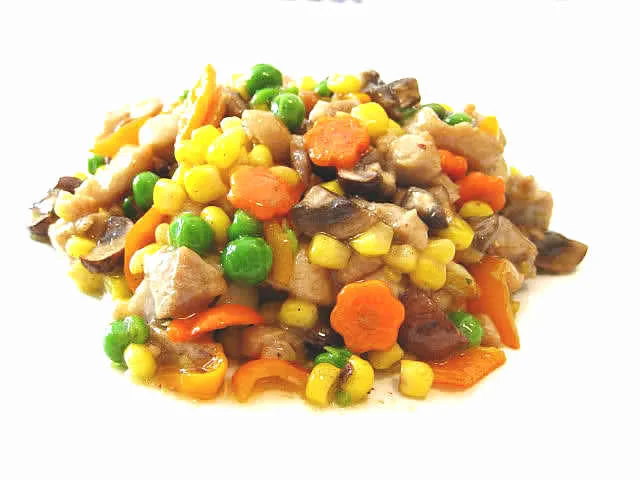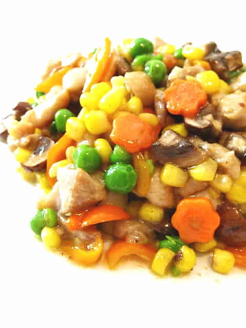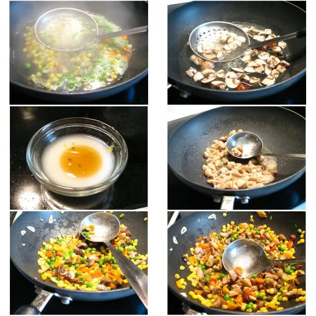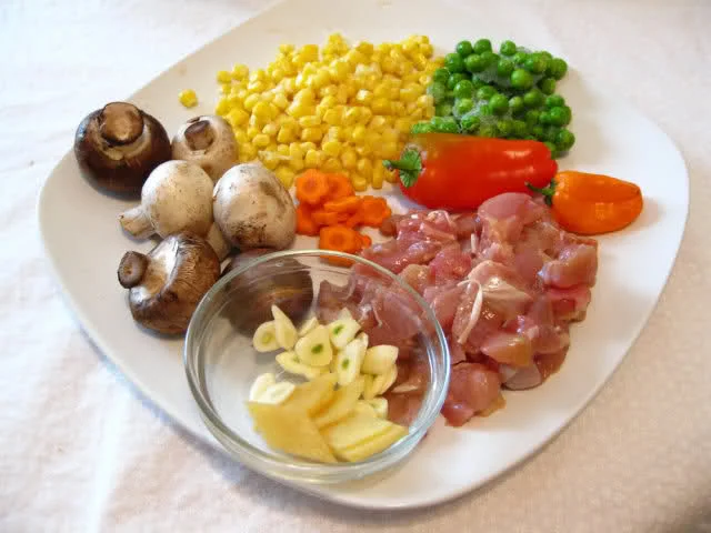 五、起锅放油,放姜片蒜片,爆香后倒入玉米、青豆、红萝卜、蘑菇、辣椒,兜几下,点入精盐、放少许糖、胡椒面、料酒,迅速翻几下;