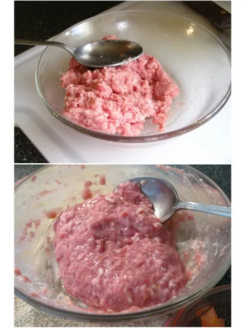 二、然后放少许盐、糖、胡椒面和生粉,再搅拌均匀。说明下:逐汤匙加水,是为牛肉碎能均匀地吸收水份,顺一个方向搅拌,是为牛肉能起胶,吃起来滑些。