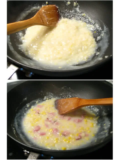 一、火腿切粒,玉米条解冻。玉米放在锅或煲里,加玉玉米粒,慢火煮(一条可做两碟饭),如果太稠,可加少许高汤或水,加少少盐、胡椒面和几滴麻油调味。