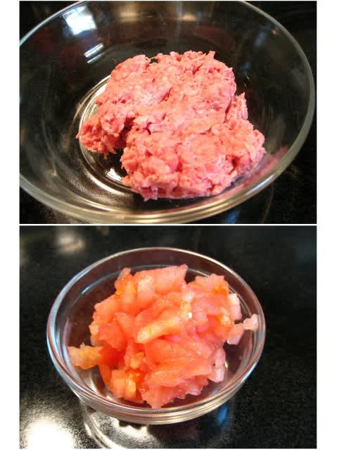 一、番茄去皮切成小粒,将牛肉碎用碗装好,逐汤匙加水,顺着一个方向搅拌均匀,再加一汤匙水,搅拌到比原来的稀些。