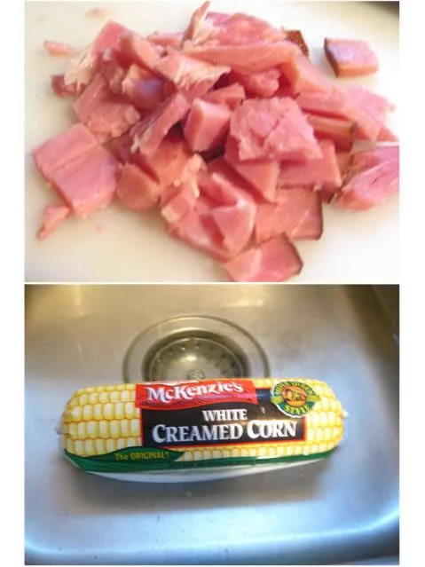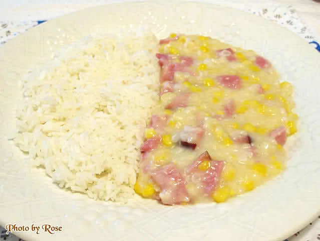 条装淇淋玉米(White Creamed Corn),小半碗玉米粒、火腿1大片、白饭。