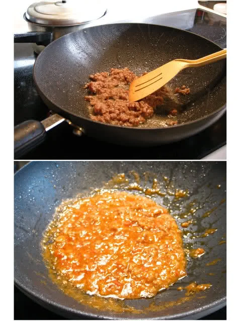 二、放切成粒的火腿,慢火熬下,让肉出味。然后铺在饭上再放在饭旁边皆可。