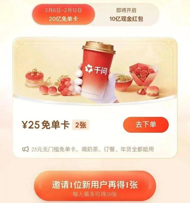 而且,每邀请一名新用户下载千问APP,双方可各得一张25元免单卡,每人最多可得21张,相当于525元大红包。有网友算了笔账,如果一家6口人参与千问免单活动,5分钟就可获得275元的无门槛免单卡,可以免费喝84杯蜜雪冰城柠檬茶。除此之外,2月13日开始,千问APP还将推出第二波活动,用户可领取现金红包,最高可得2888元。