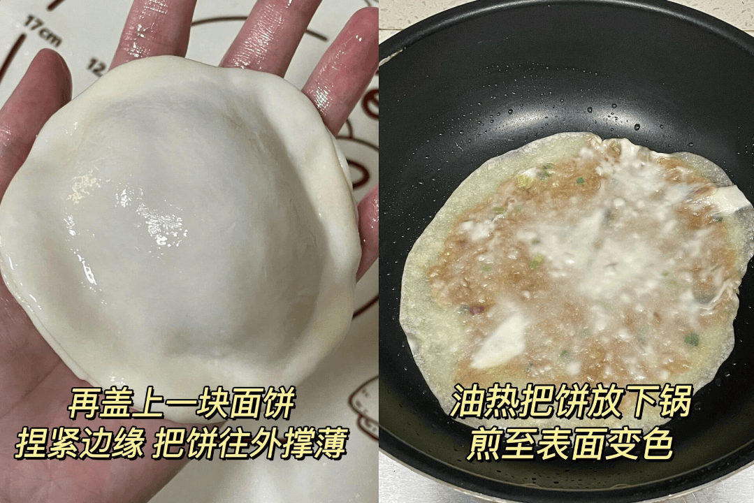 再盖上一块面饼,捏紧边缘,把饼往外撑薄,油热把饼放下锅,煎至表面变色