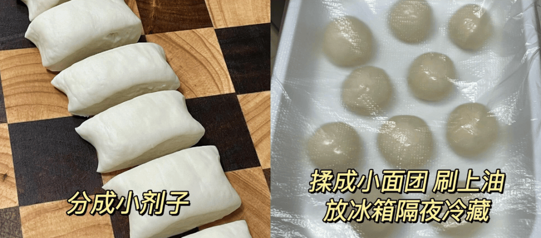 分成小剂子,揉成小面团刷上油,放冰箱隔夜冷藏