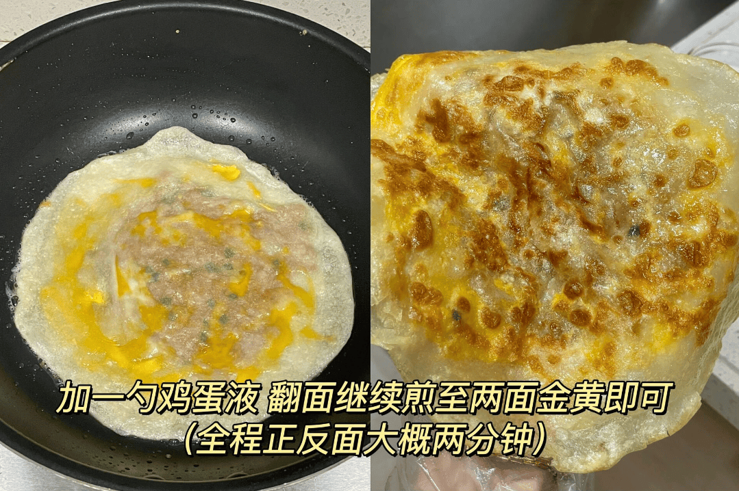 加一勺鸡蛋液,翻面继续煎至两面金黄即可,全程正反面大概两分钟