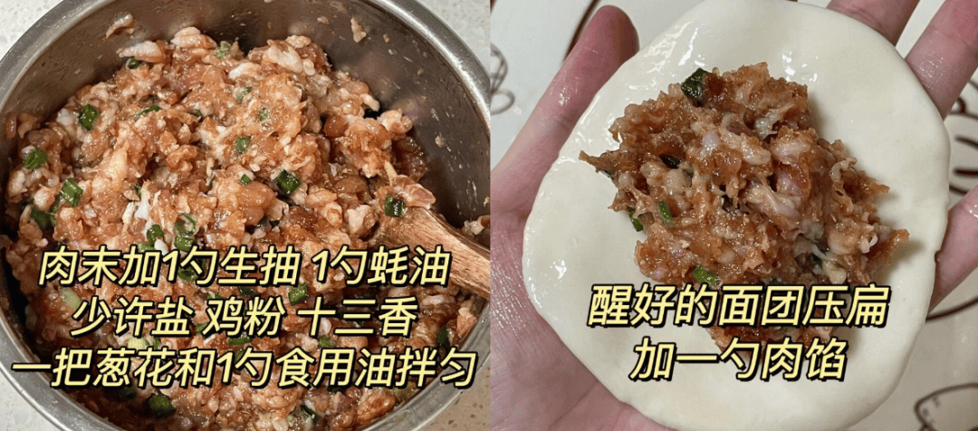 肉末加1勺生抽,1勺蚝油,少许盐,鸡粉,十三香,一把葱花和1勺食用油拌匀,醒好的面团压扁后加一勺肉馅